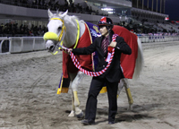 クラブ所属馬スターシップ(父クロフネ、母フラワーフェア、牡8歳、船橋・出川克己厩舎)が、1月3日(火)に川崎競馬場で行われた重賞・第48回報知オールスターカップ(SⅢ、ダート2100m)に優勝、見事に重賞初制覇を達成しています。レースはスタートから積極的に先行集団の直後、4番手からレースを進めて行きました。4コーナーで先頭に並びかけていくと、余裕十分で先頭に立ち、最後は後続に1馬身半差を付ける快勝劇を演じています。本馬は昨年まで中央競馬で活躍していましたが、新たな活路を見出すために地方競馬へと転出しました。今回は転入緒戦ながらもそれを感じさせないレースぶりで、年が明けて8歳になった本馬の可能性を広げる一戦となっています。今後とも温かいご声援を賜りますようよろしくお願いいたします。