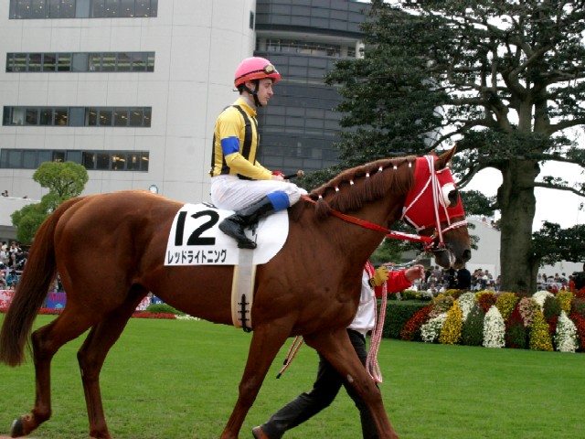 「赤い稲妻」。本馬の明るい栗毛からの連想で。明るい栗毛がターフを席捲する様をイメージして。